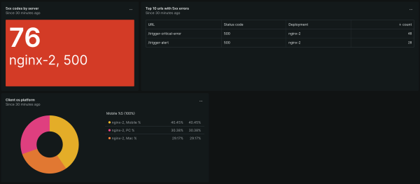 NGINX (OpenTelemetry) quickstart contains 1 dashboard. These interactive visualizations let you easily explore your data, understand context, and resolve problems faster.
